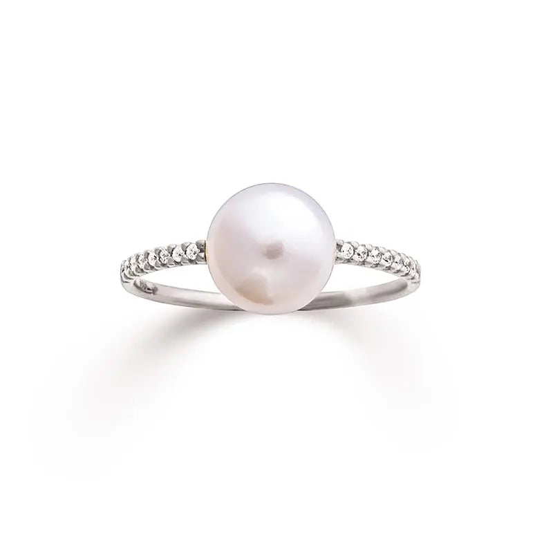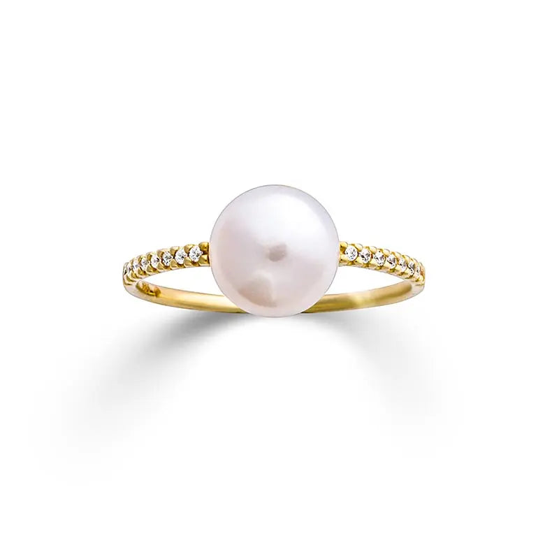 Ein stilvoller Ring aus 585er Gelbgold mit einer eleganten Süßwasserzuchtperle, umrahmt von funkelnden Zirkoniasteinen.
